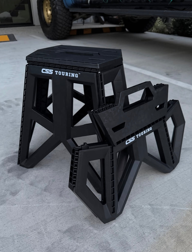 Strong, stable, and easy to carry! The CSS Touring Foldable Step Stools are perfect for travel, garage work, or everyday use. Made from durable, lightweight materials with a sturdy frame. Folds flat for easy storage and transport. Available in two sizes for any task.